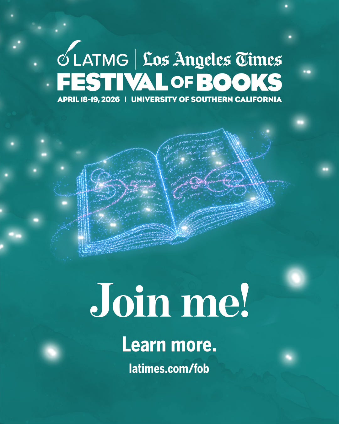 Have you been to the LA Times Festival of Books? I haven’t missed it in 20 years. It’s so huge that it’s like one of those castles that has so many wings you don’t have get along with your family at all. They can live in the east wing and you can live in the north, and you definitely don’t have to share any of the 17 bathrooms. The festival takes place on the USC campus, taking over the entire campus like a footprint of a castle. It’s the only time I get to feel like literati, so I guess it IS my castle. I have been a moderator and/or panelist for all those 20 years, but the very first year I went was with a group of writer friends. We all drove up from San Diego in a car together. I was in awe. I stood in line to see Salman Rushdie, and got a front row seat. I ran from one panel to the next, stopping only to get a lemonade at the little cart on the walkway. Oh the joy of books and authors! Grab your writer friends, or your husband, and join me in my castle.