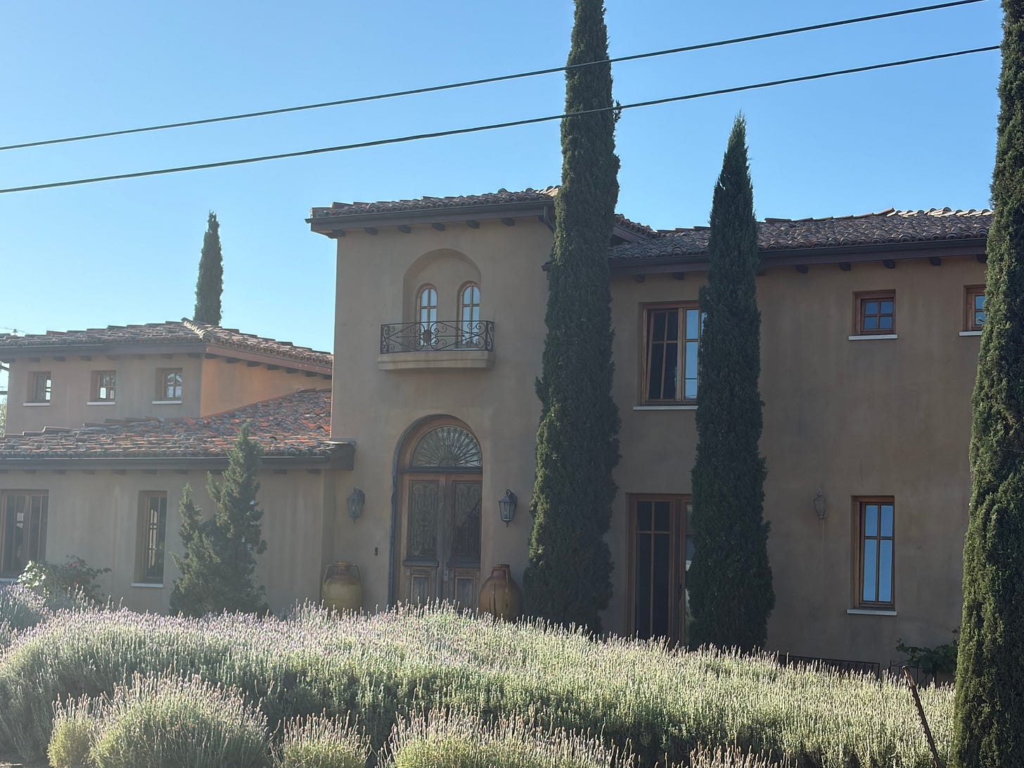 This is a home about a half a mile from my house. My neighborhood is filled with modest 1920s Craftsmans 2 bedrooms and Willie Loman-style 1950s houses. Not a single other house in my neighborhood looks like this. Which is only to say that when I’m on my walk and I come across this villa I find myself gawking a bit. It sits on a corner, so as I turn the corner, my head stays turned to absorb the details. Note the lush lavender out front, and around the corner are fig trees. I can’t see it, as much as I rubber-neck it, but I suspect the backyard is a grid of grapevines that traverse into the canyon. At first glance, I always have a moment of thinking the house is garish. When I go down the hill past the house, then past around the small cul-de-sac and back up the hill past the Italian villa again, I have by then reconciled my judgment (or is it jealousy?) that it's someone’s dream home. Did someone go to Italy on vacation, return to San Diego, found this lot with a rundown hovel on a corner, bought it for a penny, and built their villa-in-a-vineyard-dream?